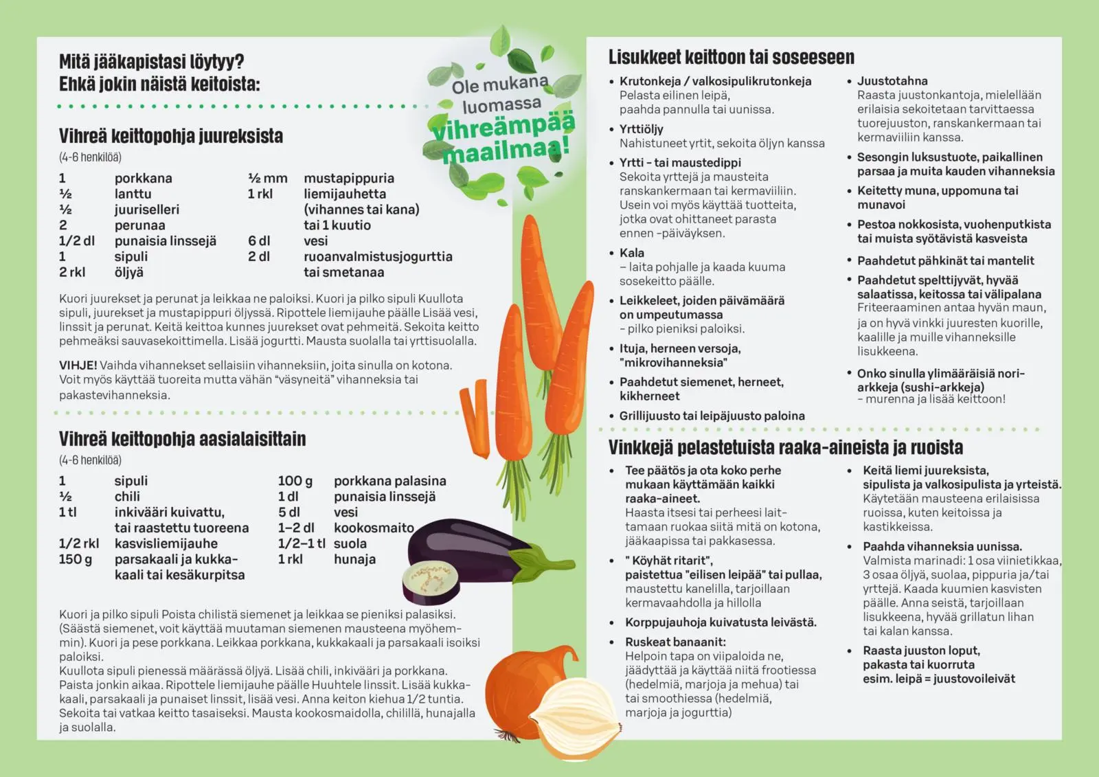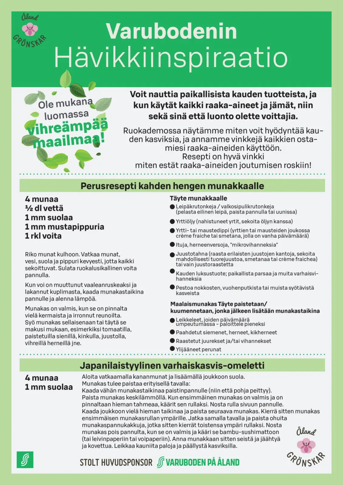 Tällä viikolla Suomessa vietetään jo perinteistä hävikkiviikkoa. Hävikkiviikko on Kuluttajaliiton kampanja, jolla halutaan herättää suomalaisia keskustelemaan ruokahävikistä ja arvostamaan ruokaa enemmän.Hävikkiviikon myötä Varuboden-Oslassa jo monta vuotta käytössä olleet hävikkilaatikot rantautuvat kaikkiin S-ryhmän S-market-myymälöihin.– Meillä Varuboden-Oslassa joka viikko on hävikkiviikko, aluepäällikkö Annina Kallinen toteaa. Meillä Hävi-laatikoiden ja Leipis-pussien koostaminen on osa arkirutiineja.Hävilaatikoihin päätyvät sellaiset vihannekset ja hedelmät, joiden ulkonäkö ei enää ole paras mahdollinen, mutta jotka ovat täysin syömäkelpoisia.– Hävilaatikot ovat meillä todella suosittuja, ja ne eivät ehdi olemaan pitkään esillä ennen kuin ovat päätyneet asiakkaiden ostoskärryihin.Hävilaatikon tuotteista voi loihtia edulliseen hintaan monenlaisia herkkuja. Jokainen voi löytää oman sisäisen mestarikokkinsa miettiessään mitä herkkuja hävilaatikon tuotteista voikaan loihtia.– Ahvenanmaalla toimimme paikallaisen Sadonkorjuujuhla-tapahtuman pääsponsorina, ja heidän kanssaan olemme kaksi kertaa järjestäneet inspiroivan Svinnspiration-tapahtuman, jossa on annettu vinkkejä, miten hävikkiruokaa – niin kaupasta kuin omasta jääkapista löytyvää – voi käyttää. Tapahtumissa on valmistettu muun muassa erilaisia sosekeittoja ja paistettu japanilaisia omeletteja, jotka on täytetty herkullisilla täytteillä.