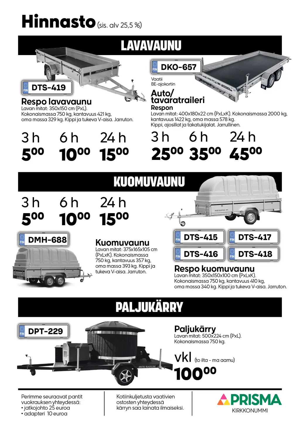 Vuokrattavat peräkärrytVuokraa peräkärry Prisma Kirkkonummesta ja ansaitse Bonusta S-Etukortillasi! Valitse tarpeisiisi sopiva peräkärry – muista, että jotkut peräkärryt saattavat vaatia erityisen ajokortinKatso Prisma Kirkkonummen aukioloajat
