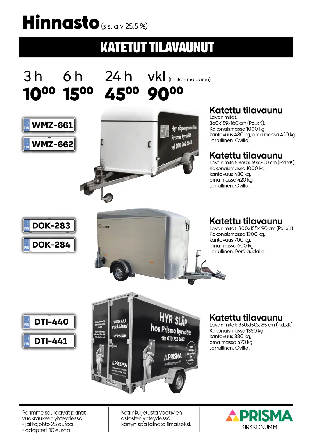 Tässä on lista tarjoamistamme perävaunuista. Valitse mieleisesi ja varaa se suoraan Prisma Kirkkonummen infopisteestä.