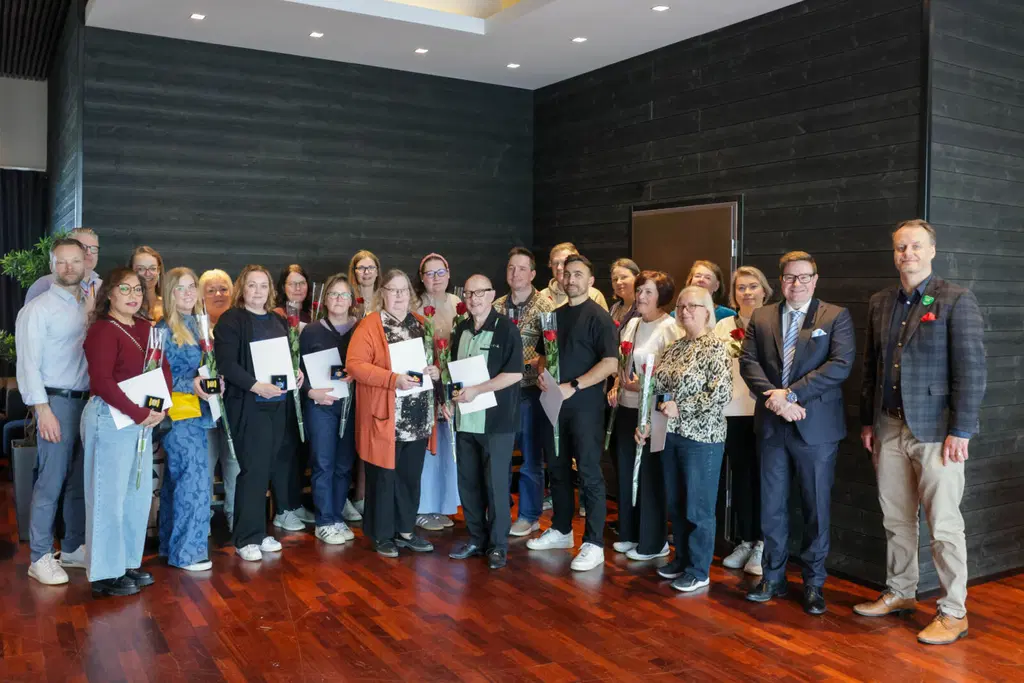 På Varuboden-Oslas kontor uppmärksammades förra veckan medarbetare som firade sitt jobbjubileum. På plats fanns medarbetare som jobbat inom S-gruppen i 10, 20, 30 eller till och med 40 år.På VBO uppmärksammas långa anställningar med en penninggåva eller betald ledighet, och dessutom belönas medarbetarna med förtjänsttecken vid en belöningstillställning som ordnas en gång per år. Under det senaste året inföll jobbjubileum för 33 personer, varav 18 var på plats vid belöningstillställningen.– Karriärernas längd vittnar om en trivsam arbetsplats, meningsfulla arbetsuppgifter och trevliga kollegor, säger personaldirektör Paula Pajunen.Bland de belönade har de längsta karriärerna redan pågått i hela 40 år. Medarbetare med långa och framstående karriärer har mycket kunskap och kompetens, och de är en betydande tillgång för handelslaget.– Erfarna medarbetare känner ofta särskilt väl till kunderna, verksamhetsmiljön och organisationens historia. Lyckligtvis förs den tysta kunskap de besitter stegvis vidare till yngre kollegor: genom introduktion, handledning i det dagliga arbetet och genom gott exempel. Ingenting kan dock ersätta det hårda arbetet hos dem som har haft en lång karriär hos oss – de bidrar med stabilitet och förutsägbarhet i ett arbetsliv som ständigt förändras, betonar Pajunen.De som firar sitt jobbjubileum uppmärksammas på sin egen arbetsplats, och enligt en tradition som inleddes för några år sedan bjöds alla som firat sitt jobbjubileum under det gångna året även in till en gemensam belöningstillställning på Varuboden‑Oslas kontor i Vanda. Efter ett festtal av vd Mathias Kivikoski belönades jubilarerna med förtjänsttecken och gemensam lunch.Varma gratulationer till alla som firat jobbjubileum!