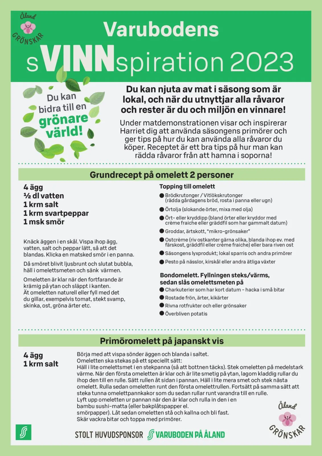 Den här veckan firas den redan traditionella spillveckan i Finland. Spillveckan är en kampanj som ordnas av Konsumentförbundet, och med den vill man få finländarna att diskutera matsvinn och att visa större uppskattning för mat.Under Spillveckan kommer Svinnlådorna, som har sålts i Varuboden-Oslas butiker redan i flera års tid, att komma till alla S-marketbutiker i hela landet.– Hos oss på Varuboden-Osla är varje vecka spillvecka, konstaterar distriktschef Annina Kallinen. Hos oss är det en del av de vardagliga rutinerna att plocka ihop Svinnlådor och Brödispåsar.I Svinnlådorna hamnar sådana grönsaker och frukter, som inte längre ser så bra ut, men som fortfarande är fullt ätbara.– Svinnlådorna är väldigt populära hos oss, och de hinner inte stå framme länge, innan de har hittat ner i kundvagnarna.Av produkterna i Svinnlådorna kan man tillreda många olika slags delikatesser till ett verkligt förmånligt pris. Var och en kan hitta sin egen inneboende mästerkock, när hen funderar över vilka delikatesser produkterna i lådan kan användas till.– På Åland fungerar vi som huvudsponsor för Skördefesten. Tillsammans med dem har vi två gånger ordnat en matdemonstration under namnet Svinnspiration, där kunderna har fått tips på hur de kan använda svinnprodukter – både sådana som man köpt i butiken och sådana man hittar hemma i kylskåpet. Vid Svinnspirationerna har man bland annat lagat olika purésoppor och japansk omelett med delikata fyllningar.