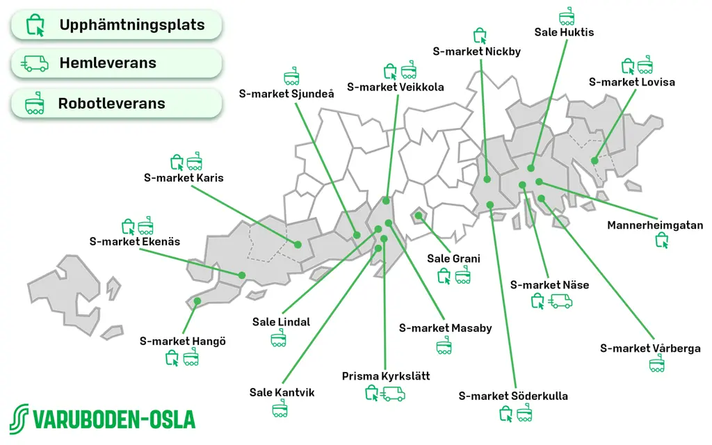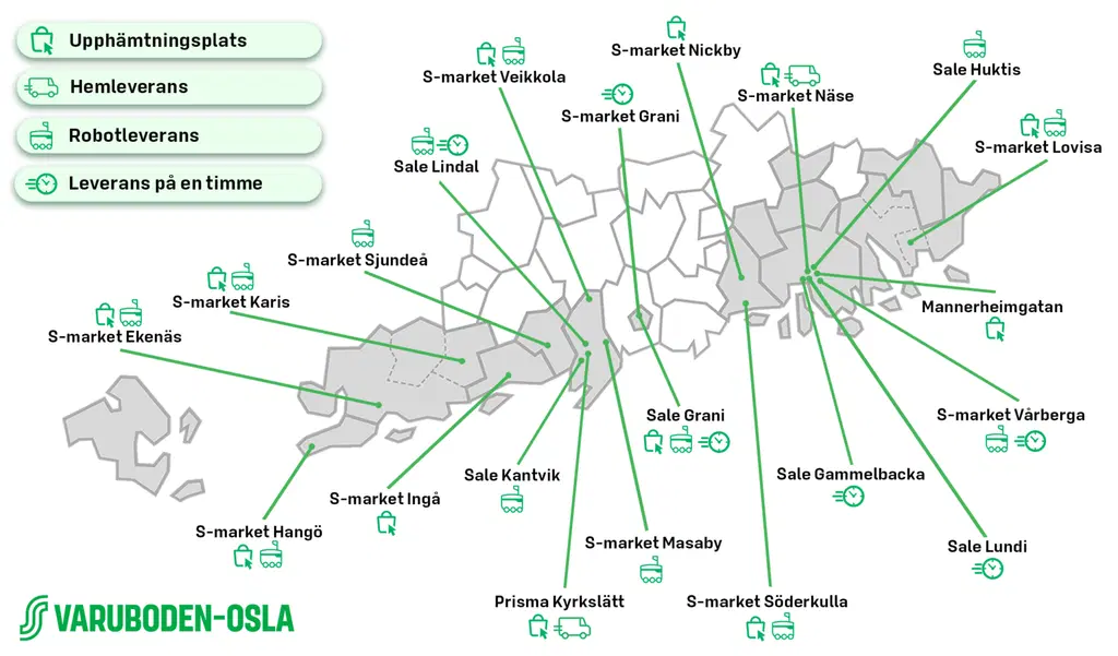 Våra onlinebeställningar gör det enkelt att hålla koll på allt du behöver—utan att du behöver lämna soffan. Hämta upp din beställning i butik när det passar dig eller beställ dina inköp fram till din hem dörr.På kartan nedan kan du se om Varuboden-Oslas Matbutik på nätet är tillgänglig där du bor, samt vilka butiker som erbjuder tjänsten. Du kan kolla butikens öppettider här vbo.fi/tjanster